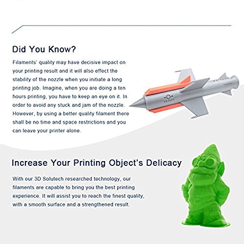Ultra smooth technology our ultra smooth technology includes filaments capable of beautiful and smooth Extraction to help build even the most delicate objects. Vacuum sealed we use vacuum-sealed packaging to isolate the moisturized environment and filament, and provide the best performance possible. High compatibility our filaments have been tested on various 3D printer brands, receiving widespread and positive customer feedback. 3D Solutech is a professional filament manufacturer specializing in providing a wide range of colors and materials for 3D printing. Quality is always our top priority, and we check each spool, vacuum seal, and package by hand to ensure optimal product quality. Our filament is a proven winner, and maintains the smooth and consistent printing experience needed to achieve the best printing results. Our filament is always round, and contains no oily residue, air bubbles, kink, use or breaks. Check out our store for the latest colors and materials for your 3D printer. Package includes: 1 x 1.75mm real Orange PLA filament (2.2lbs) 1 x filament clip.