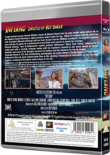 Blu-ray Region Free. DVD edition also available. 3D Film Noir from the Golden Age of Hollywood 3D Filmmaking. In stunning Blu-ray with Dolby TrueHD lossless audio. Region FREE. Hard-nosed business tycoon Donald Whitley Carson III (Robert Ryan) is tested when left to die in the Mojave Desert following a riding accident, which broke his leg. When he realises that his wife Geraldine (Rhonda Fleming) and lover Joseph (William Lundigan) have left him to perish, he determines to survive to wreak his revenge. Special Features: Rhonda Fleming on the Wonders of the 3rd Dimension; Theatrical trailer; Pat Boone interviews Rhonda Fleming in 2009; 16 page illustrated booklet; 2D and 3D on a single disc. DIRECTOR: Roy Baker ACTORS: Robert Ryan, Rhonda Fleming, William Lundigan, Henry Hull BBFC CERTIFICATE: PG - Parental Guidance: mild violence, threat FEATURE RUNNING TIME: 83 mins FORMAT: Blu-ray All Regions | Aspect ratio 1.37:1 | Technicolor THEATRICAL RELEASE DATE: 1953 TOTAL RUNNING TIME: 102 mins