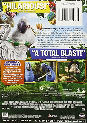 The entire cast of the animated smash RIO returns in RIO 2, and they are joined by a new flock of top actors and musical talents. Rich with grandeur, character, color and music, RIO 2 finds Jewel (Anne Hathaway), Blu (Jesse Eisenberg) and their three kids leaving their domesticated life in that magical city for a journey to the Amazon. They encounter a menagerie of characters who are born to be wild, voiced by Oscar nominee Andy Garcia, Oscar/Emmy/Tony-winner Rita Moreno, Grammy winner Bruno Mars, and Tony winner Kristin Chenoweth.